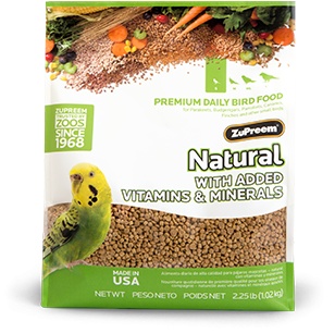 ZuPreem® Natural with added vitamins, minerals and amino acids provides healthy and delicious nutrition for everyday feeding. ZuPreem® Natural includes wholesome nutrition - Celery, Carrots, Parsley, Beets, Blueberries, Cranberries, and Ground flaxseeds are in each delicious pellet. ZuPreem® Natural diets are made with a consistent pellet color and shape to help keep your bird from selecting specific pellets in the food cup.